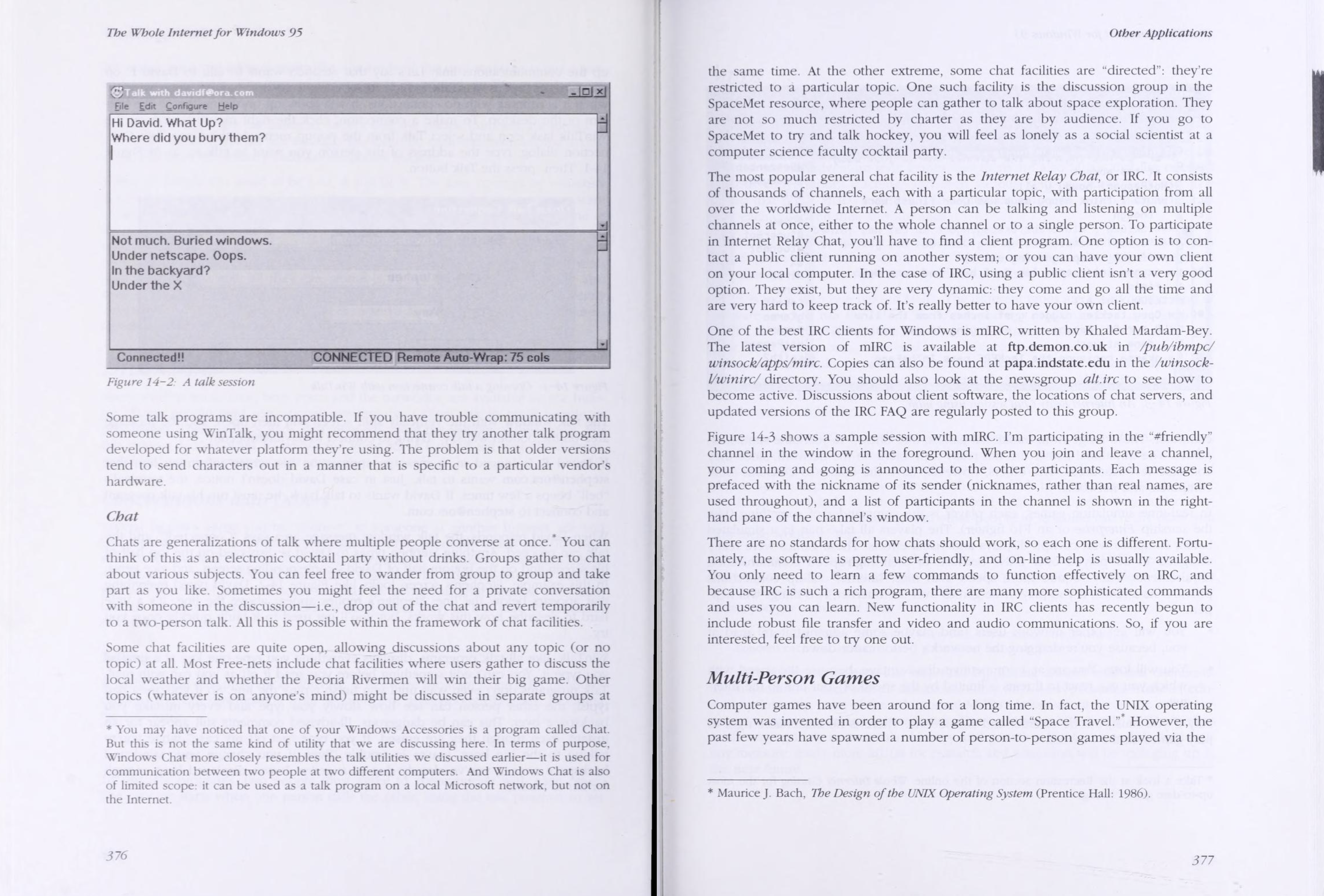 - Early versions would interleave streamed text from participants on the same line; this was addressed later with each participant getting a separate section of the screen instead.